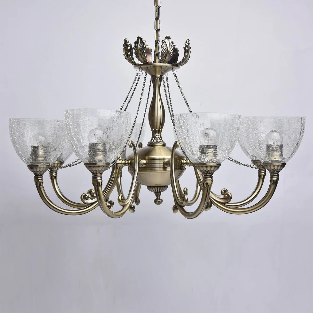 Металлическое основание цвета античной бронзы, плафоны из льдистого стекла, декоративные элементы и